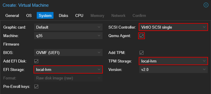 - Set "TPM Storage" to the appropriate storage device. Typically set to the same storage device as your primary disk, as described in the next section.