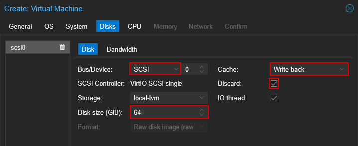 When using a single disk, VirtIO SCSI and VirtIO SCSI Single will perform identically. The difference begins to matter when you attach multiple disks and enable IOThreads (in the next step). Standard SCSI assigns one controller for up to 16 disks, while SCSI Single gives each disk its own controller. Enabling IOThreads assigns one thread per SCSI controller. This means you get the best performance using SCSI Single with IOThreads. However, keep in mind to ensure your Proxmox host has enough compute resources to handle all the controllers and threads used across all VMs.