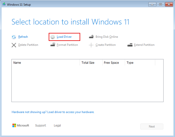 When you reach the selection of which disk to install Windows on, you'll notice that no disk is listed, even though a virtual disk was assigned to the VM. Follow the steps below to install the VirtIO SCSI drivers, which enable communication with the virtual disk.